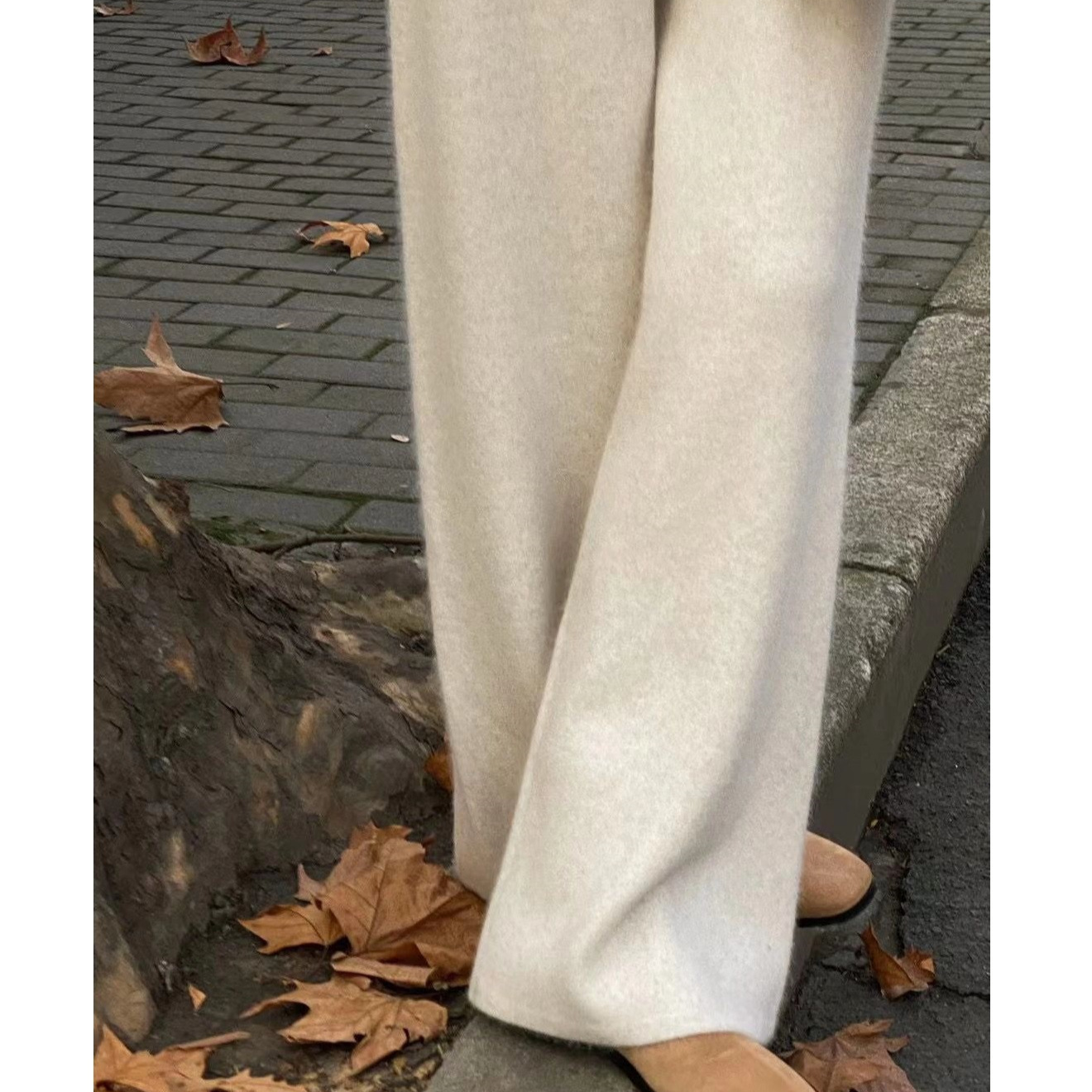 オル秋冬の女性用イミテーションウールニットルーズストレートパンツ、カシミアワイドレッグパンツ、小柄な人向けのポケット付きフロアレングスパンツ