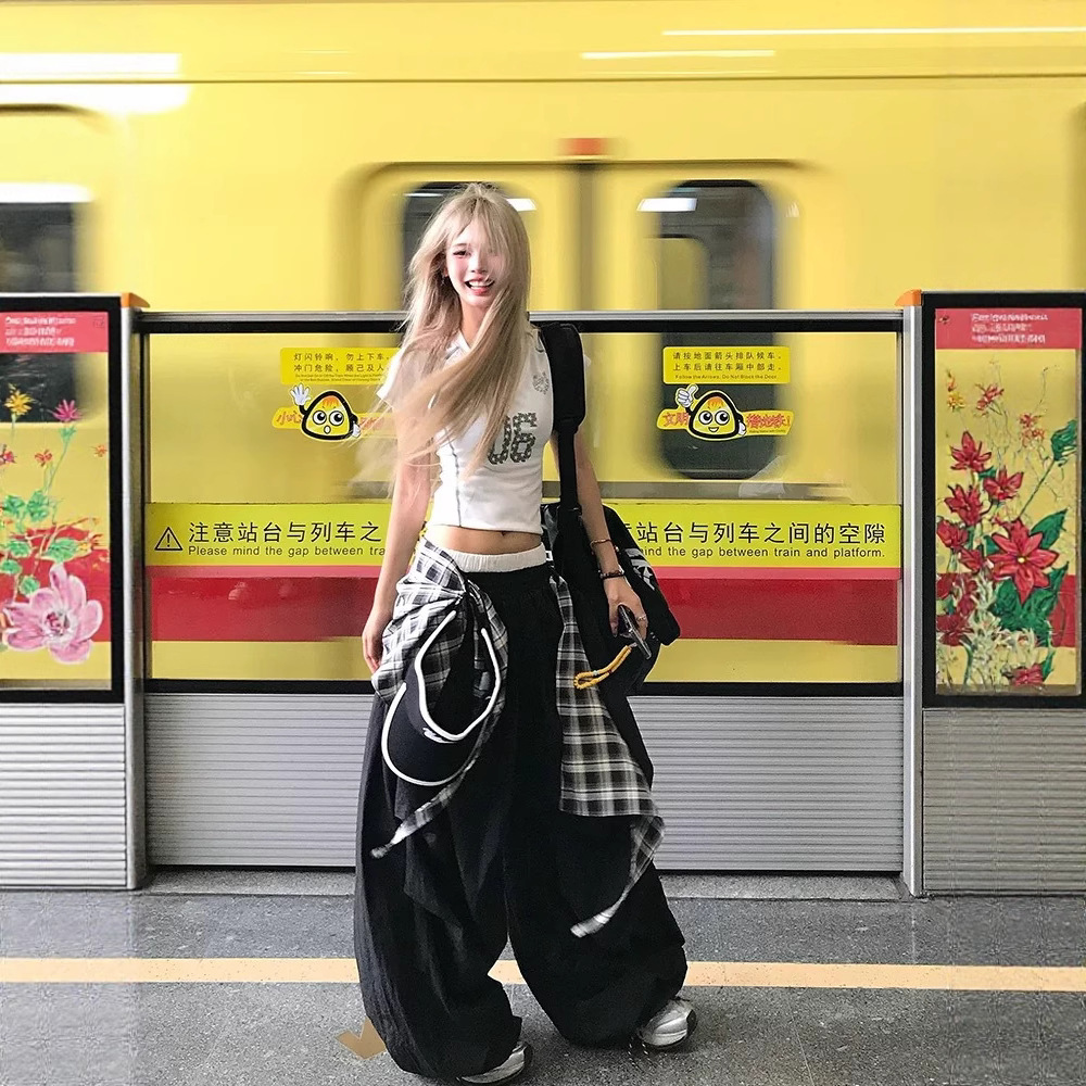 超きれいなギャル風傘兵工装ズボン女性2025夏の薄いしわの広い足がカジュアルなズボンの潮を引きずっている