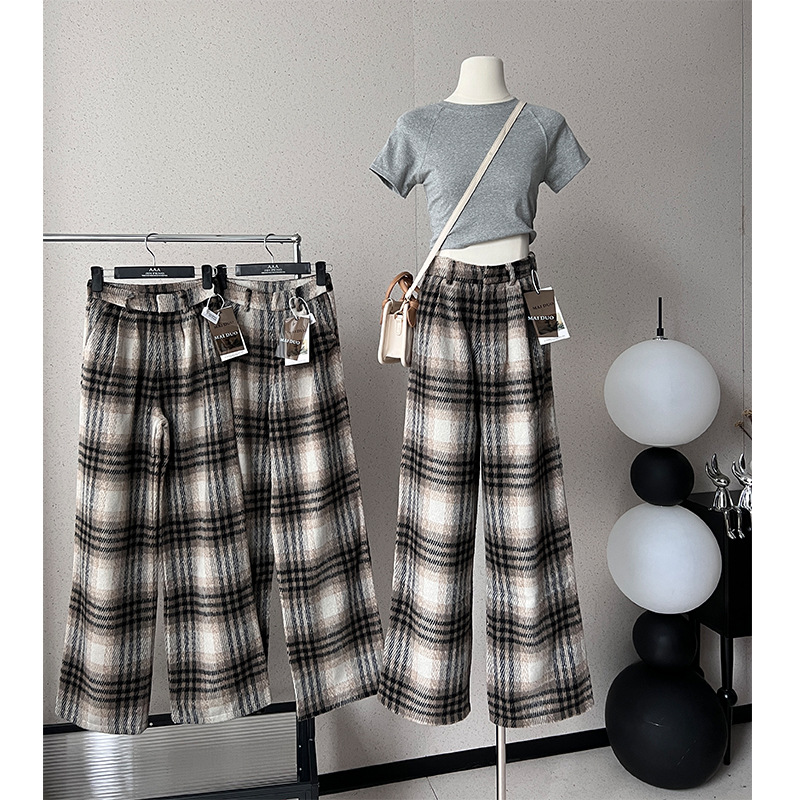 現物のSUNONEONEウールの毛は格子縞のズボンの女性の秋冬の広い足のゆったりしているカジュアルなストレートのズボンです。