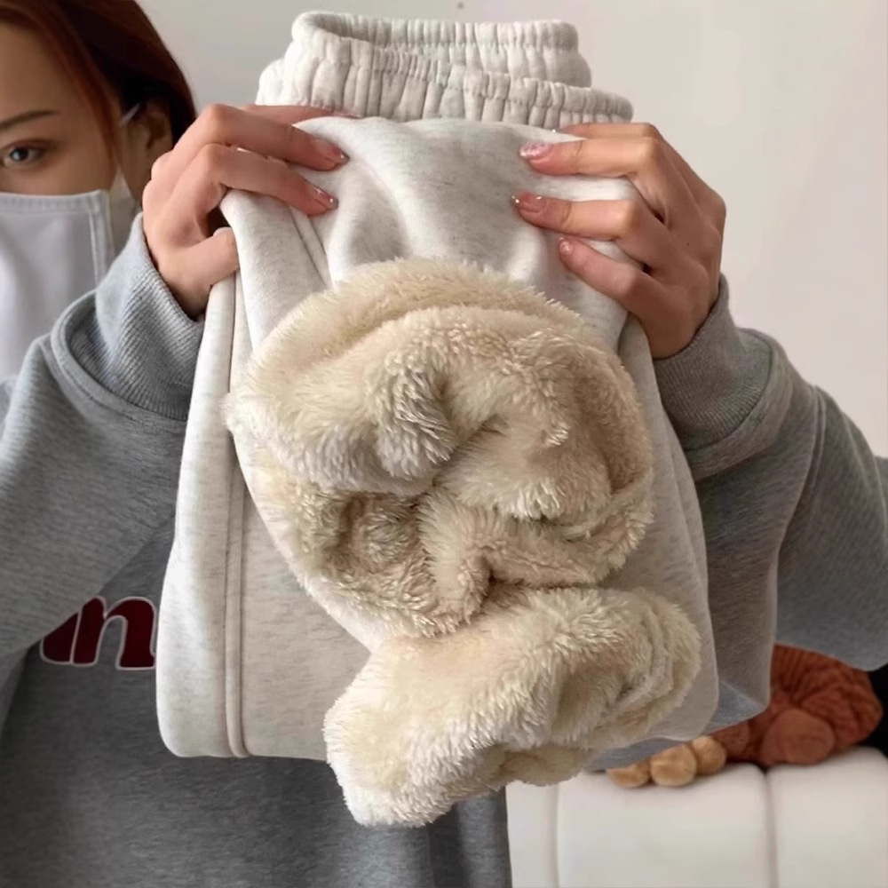 子羊の毛の広い足のズボンの女性の春秋のベルベットの厚い冬の綿のズボンの衛のズボンの運動のズボンの2024の新型の小さい子