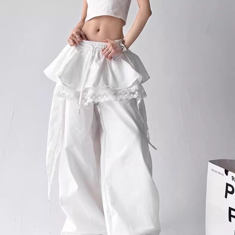 デザインされたスプライシングレイヤードスカートワークウェアカジュアルパンツ女性の夏アメリカンレトロルーズスリミングストレートワイドレッグパンツ