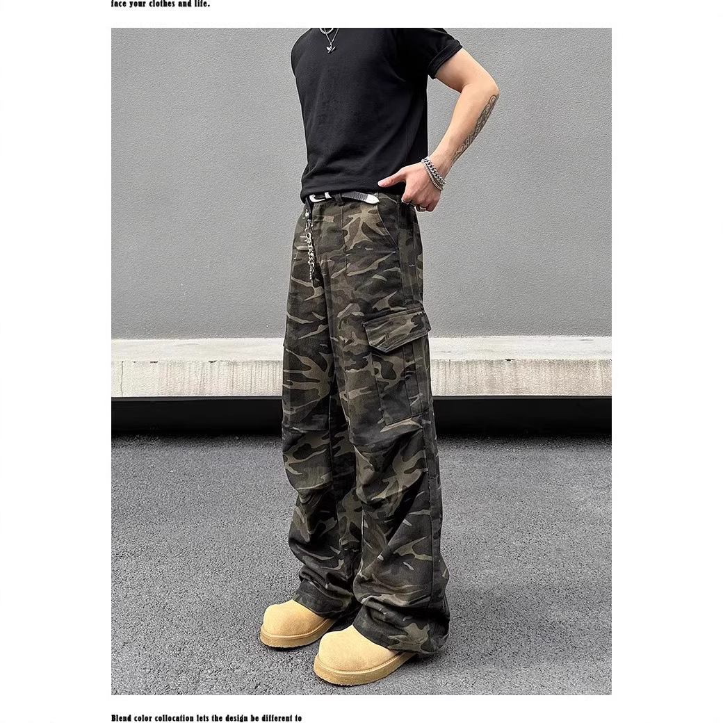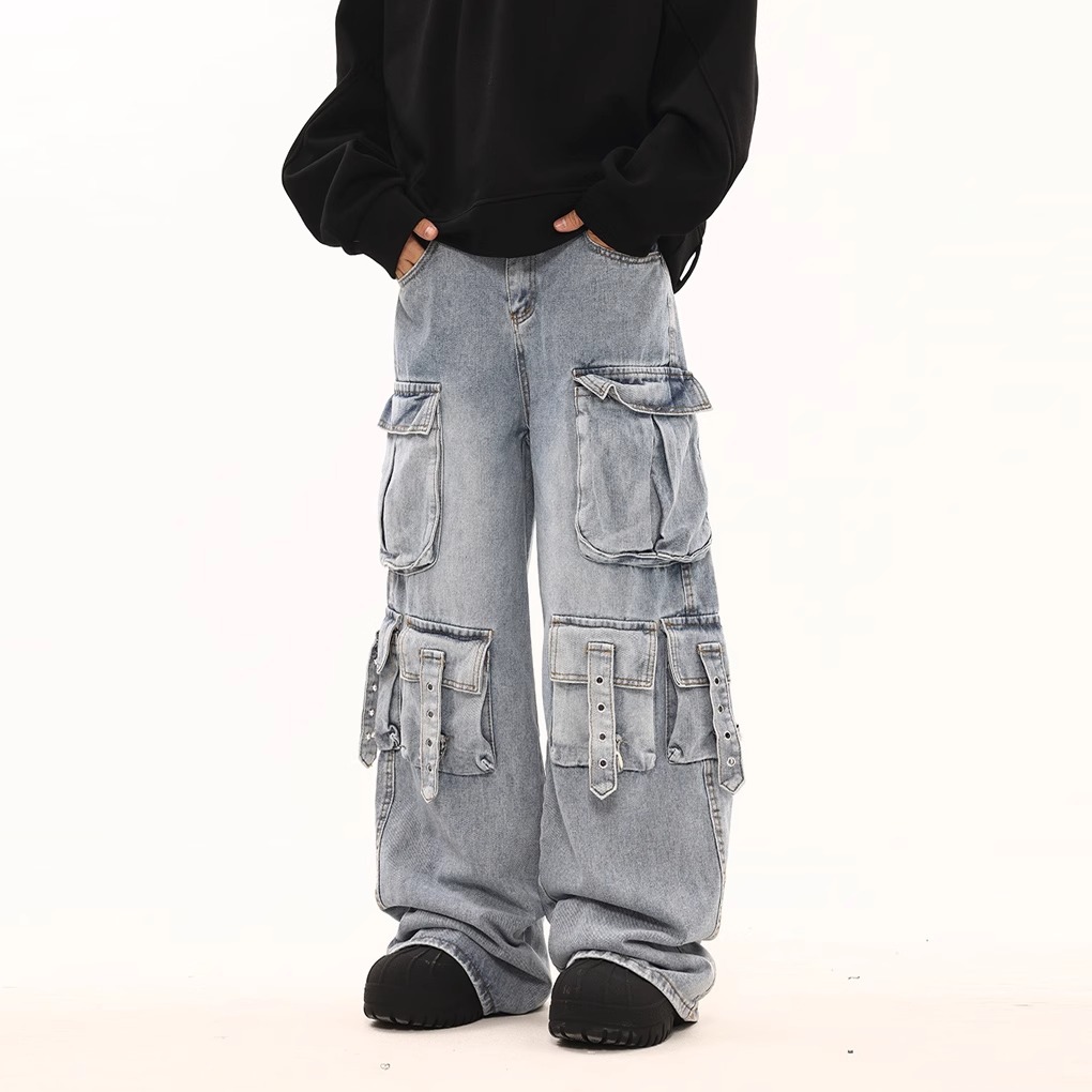マルチポケットワークジーンズメンズストレートレッグルーズワイドレッグアメリカンハイストリートパンツトレンディブランドハンサムデザインパンツ