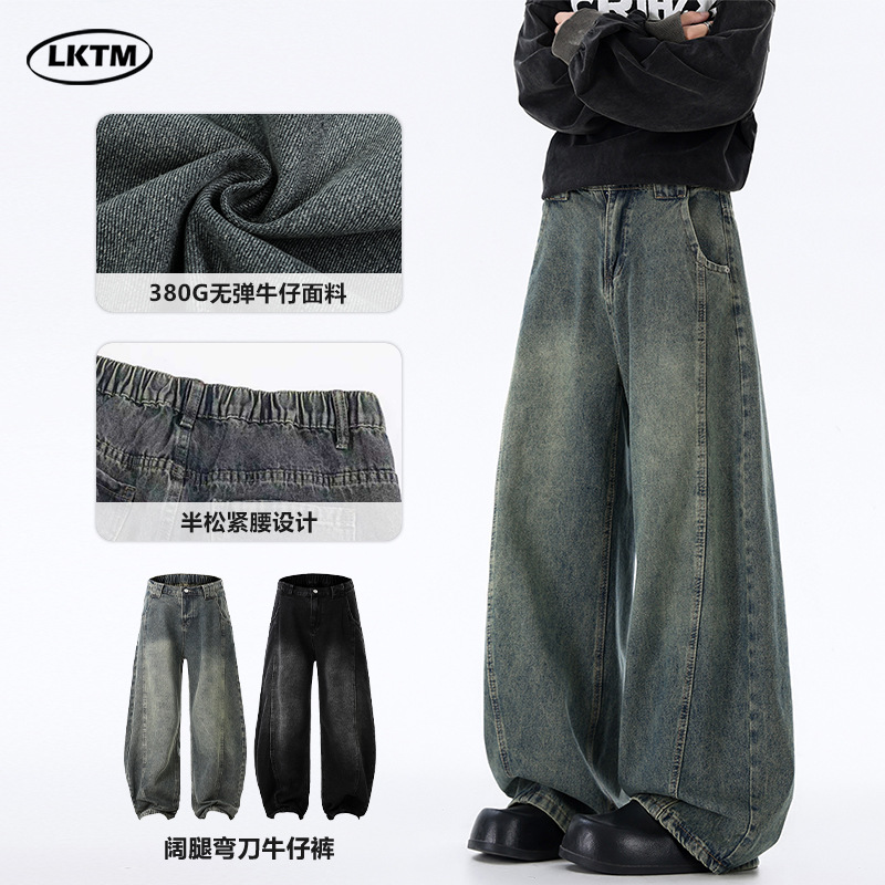 LKTM メンズ アメリカン レトロ ウォッシュ デコンストラクト シミターデニム パンツ 男女兼用 トレンド ブランド ワイドレッグ バギー シミターパンツ