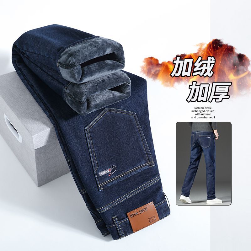 高級品質のメンズジーンズ、ゆったりとしたストレートパンツ、カジュアルな中年男性用パンツ、2025年秋冬、裏起毛メンズパンツ