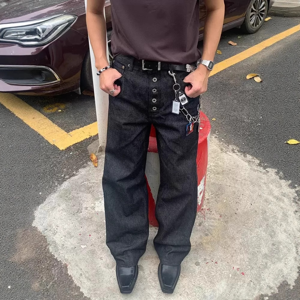 高品質5連ボタン未脱色オリジナル牛革14オンスルーズソリッドカラーストレートAラインワイドレッグバギーデニムパンツ