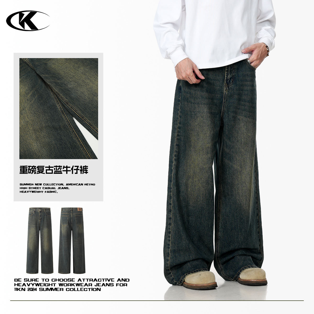 11KNアメリカンレトロブルーストレートジーンズ男女兼用ストリートウォッシュ加工スリムワイドレッグルーズカジュアルパンツ