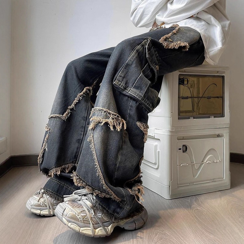 メンズリップドジーンズ、ルーズストレート、カップルシミターワイドレッグ、アメリカンハイストリートデザインパンツ、トレンディなブランド、ハンサム