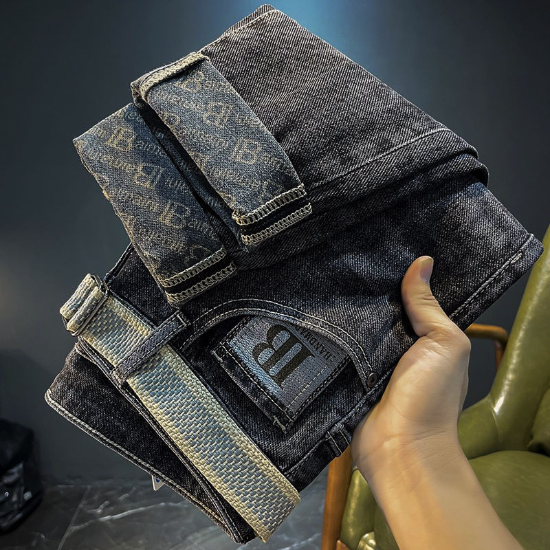 アメリカのレトロな青いジーンズの男性は秋の高級感のあるカジュアルなズボンを着ています。