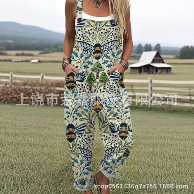 2025 新しいクロスボーダー婦人服アマゾンヨーロッパとアメリカの夏デジタル 3D プリントボタンサスペンダーカジュアルパンツサスペンダーパンツ