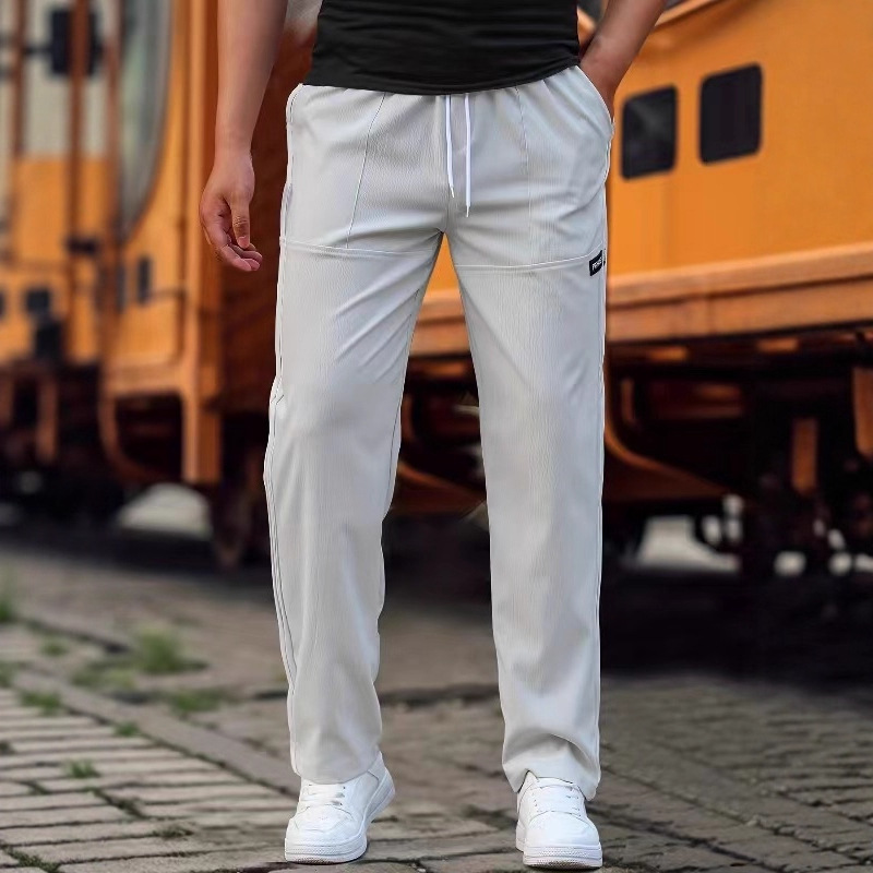 クロスボーダー卸売アイスシルクメンズパンツ、夏用薄手ルーズストレートメンズカジュアルパンツ、高級ポリエステルパンツ、ビジネスパンツ