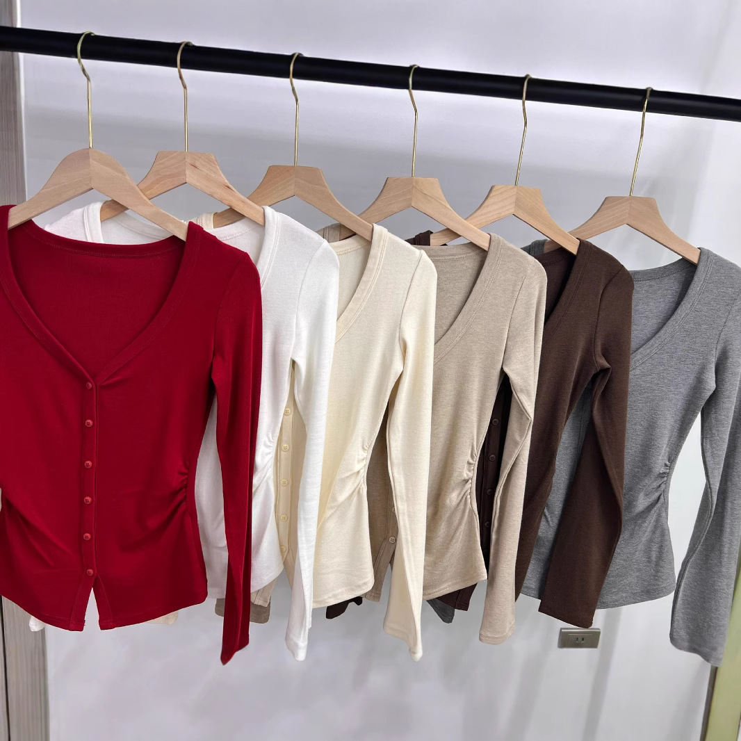 2024秋冬新作純欲低vネック長袖女性列ボタン内に身を修めるシャツの上着