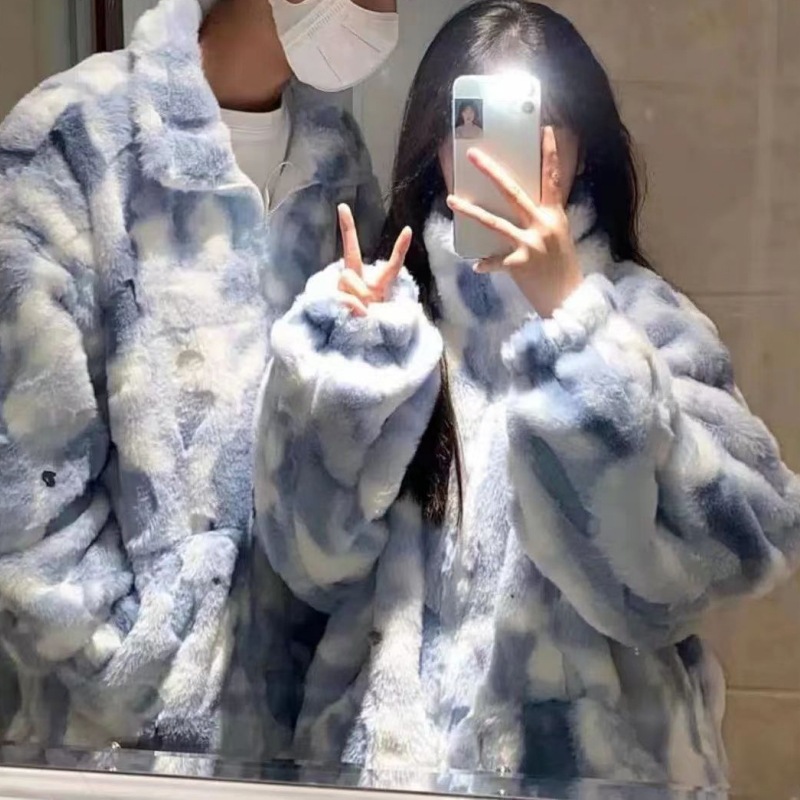 女性用タイダイラムウールジャケット、2025年秋冬新作、ゆったりとした学生向け、厚みのあるベルベットジッパー付きスタンドカラートップス