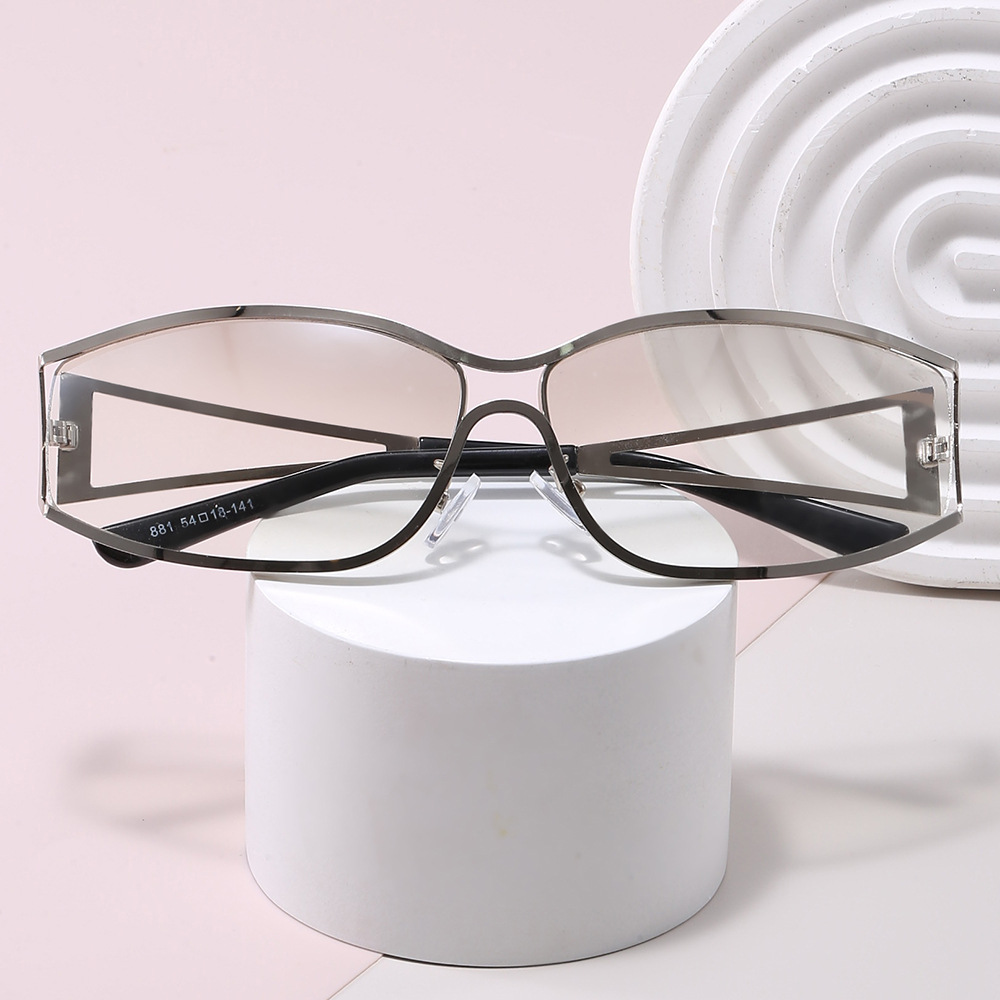 メーカーの卸売りは縁なしのメガネの四角形の男女のサングラスの金属の欧米の街を切って潮流の越境のサングラスを撮影します。