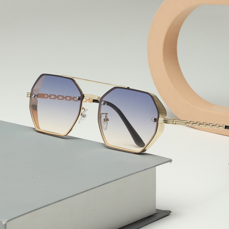 2024国境を越えた新型多角双梁サングラス女性ファッション金属チェーン鏡脚日除けサングラス