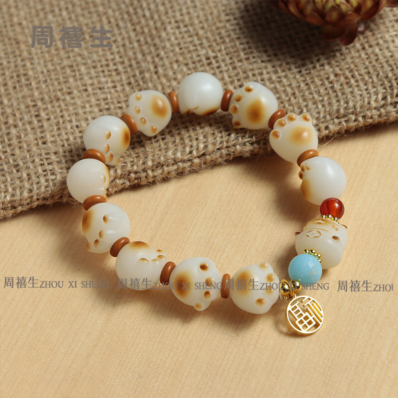 天然新疆金糸玉菩提猫爪手串招財猫合金福牌多宝手串銭袋福禄配珠