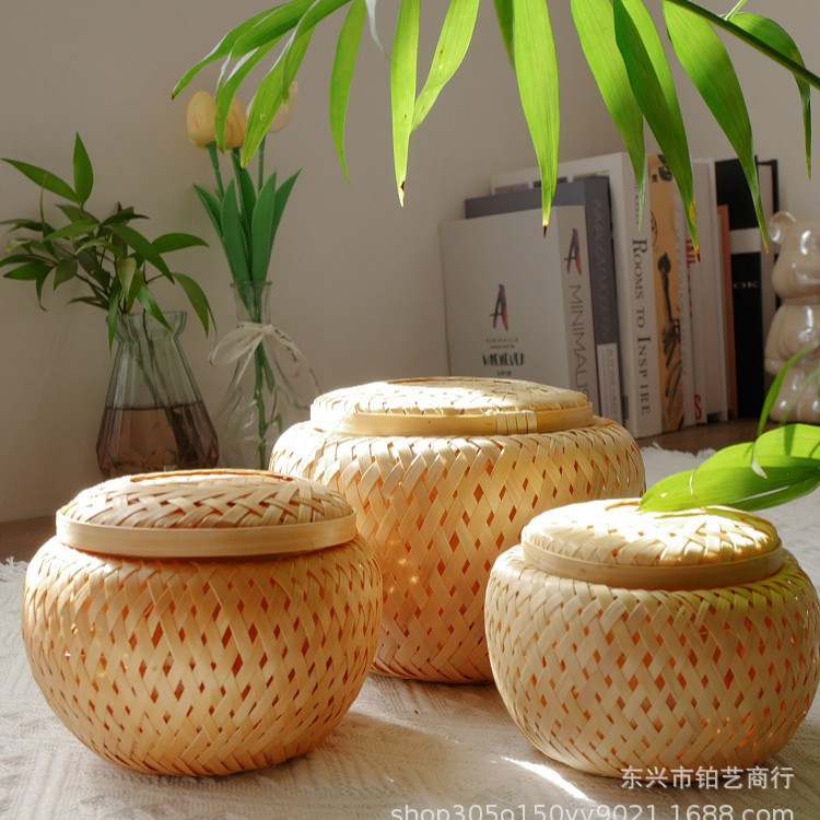 手作り竹編み収納ケースレトロ蓋付き茶器収納バスケット家庭用整理バスケット日本式パレット果物バスケット