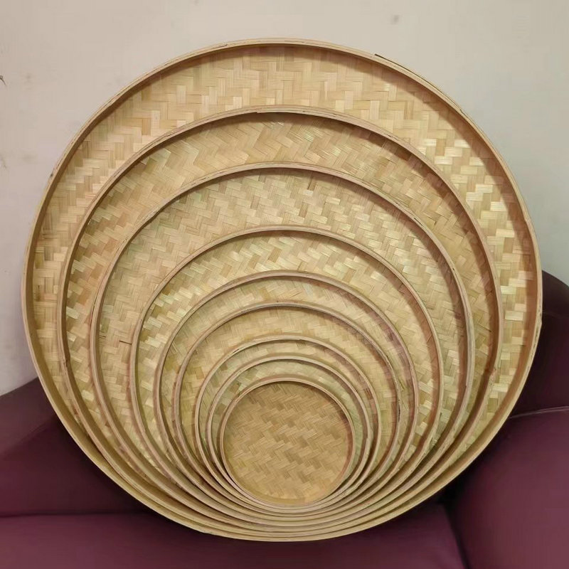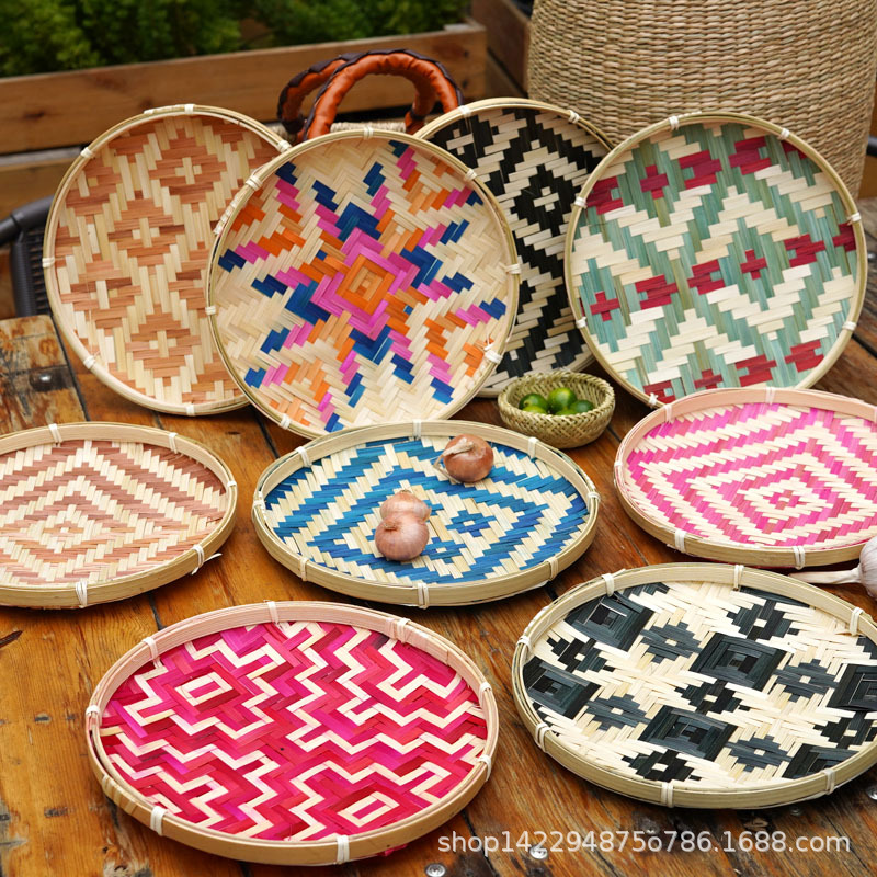 ダンス用の竹製フラットカラーダストパン、家庭用フルーツ収納バスケット、スナックトレイ、パフォーマンスデコレーション用のカラフルな竹製トレイ