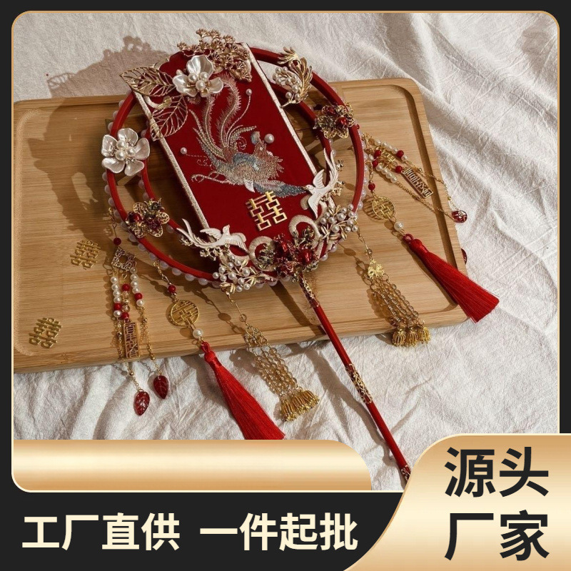 結婚新婦団扇古風双圏完成品中国式結婚式赤秀禾扇手作り喜扇材料包