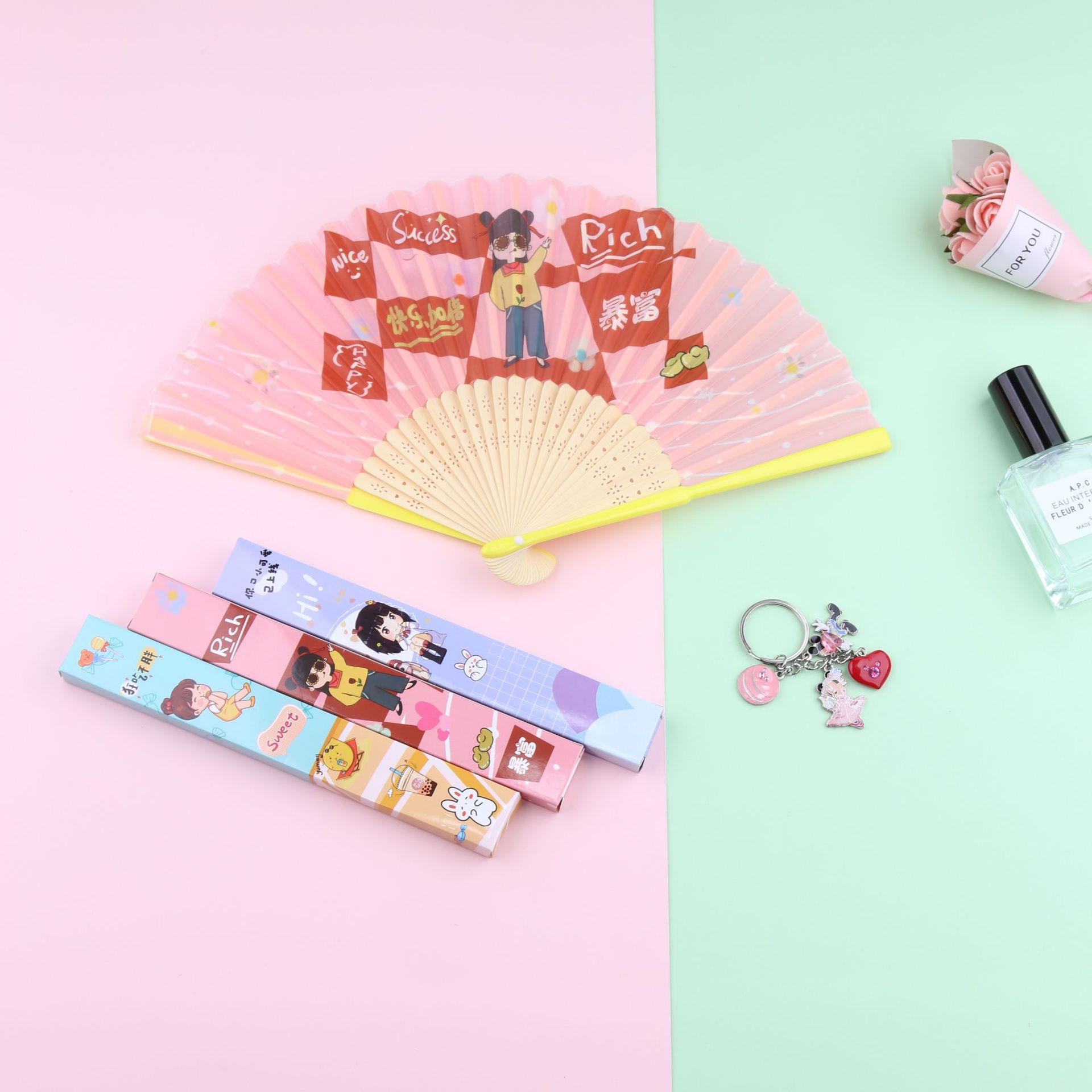 かわいいアニメの潮語のカラーの竿の女性の折り畳みの扇子の箱の扇子の卸売りのメーカーの文房具の文創の工場は直接供給します。