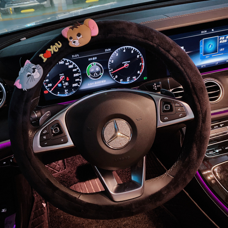 冬のハンドルカバー、ショートベルベット、暖かい、韓国風、キュートでファッショナブルな漫画の車内インテリア、冬のハンドルバーカバー、豪華な
