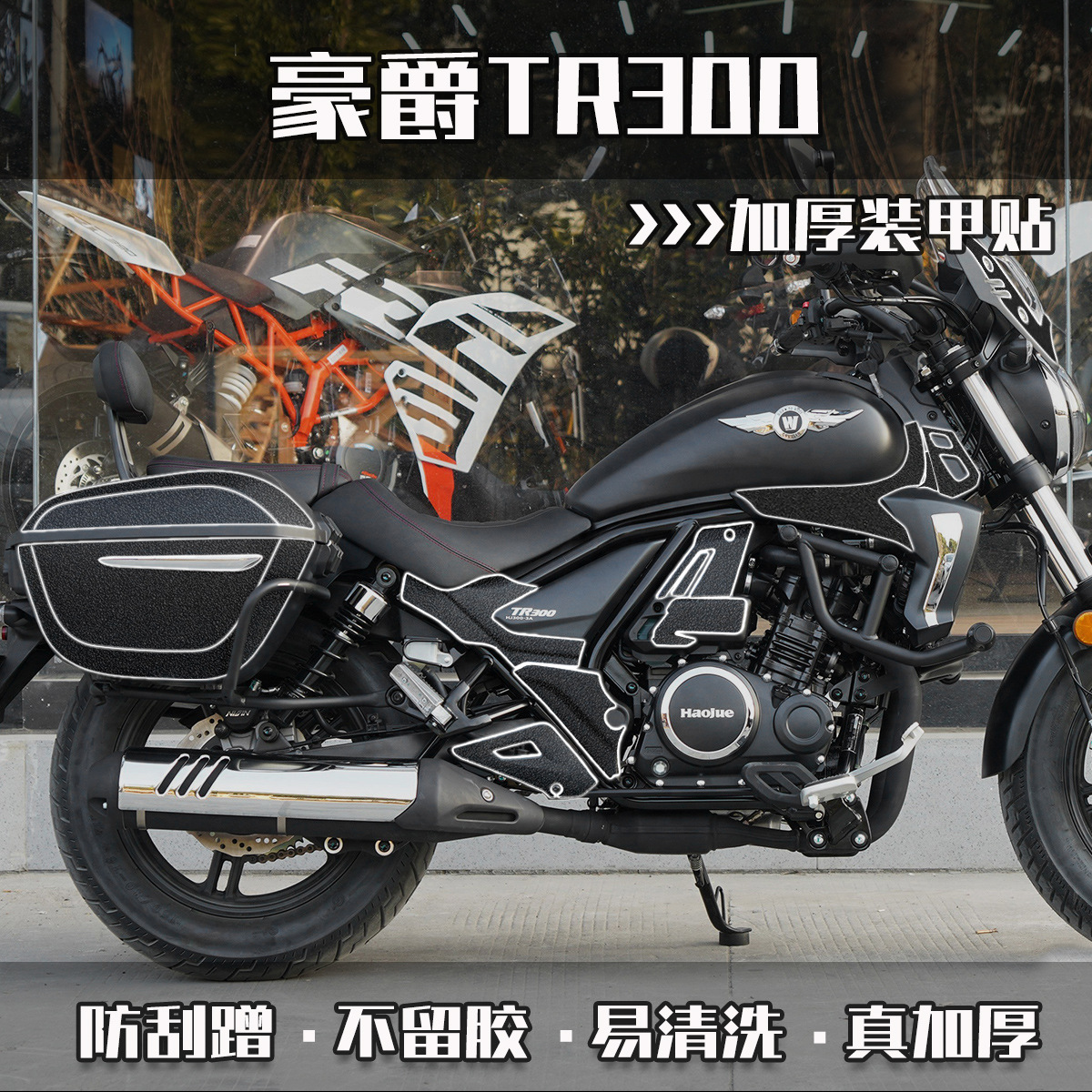豪爵TR300車体を適用して、つや消し装甲を厚くして、防傷保護シールを改造して、後ろの箱の滑り止めを装飾します。