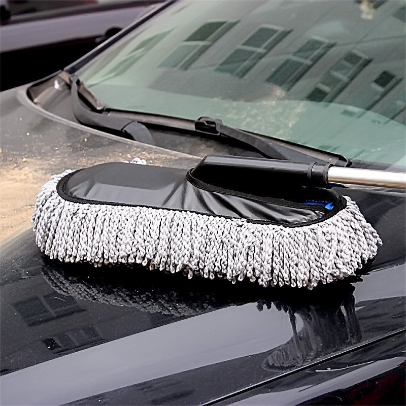 自動車は伸縮ワックスでほこりを落として灰色の車を掃除します。