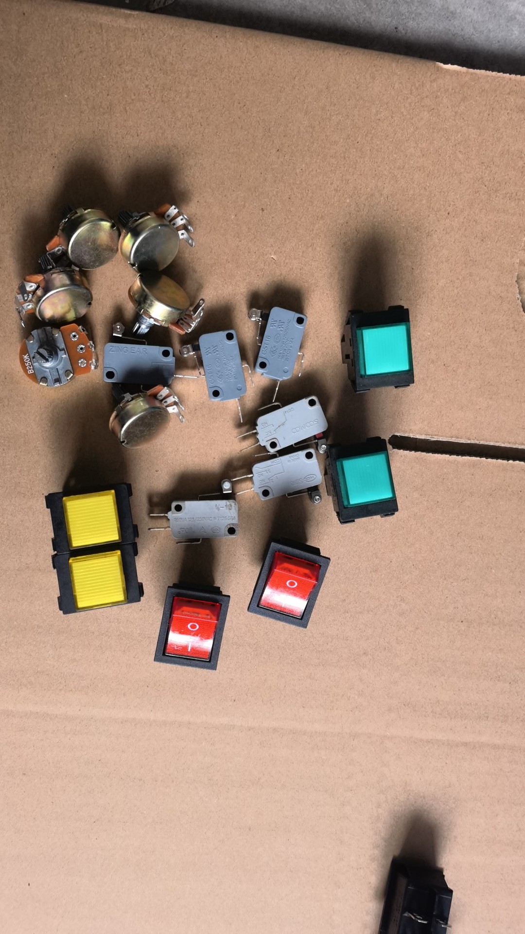 メーカーの半自動梱包機付属品、ベルト長調整ノブ、ポテンショメータ、各種スイッチ