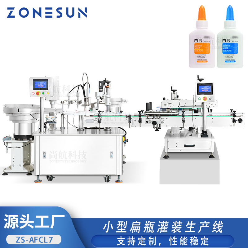 ZONESUN 小型フラットボトル充填生産ラインフラットボトルホワイトラテックス充填キャッピングラベル 3-in-1 自動ライン