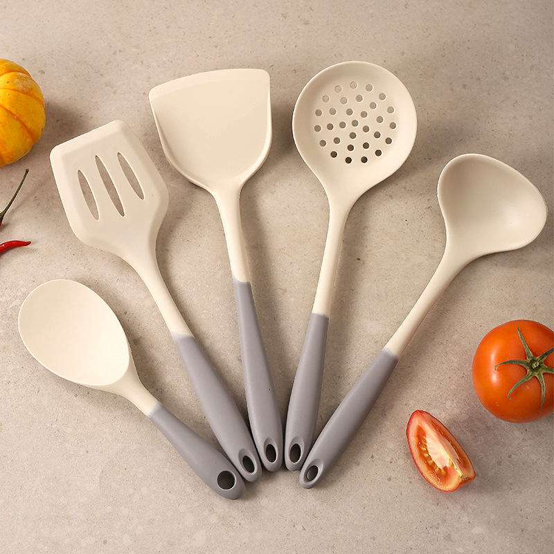 キッチンツールシリカゲルの台所用品の灰色の鍋シャベルのシリカゲルのステンレスの取っ手は鍋の炒め物のシャベルのスプーンのセットにくっつかないです。