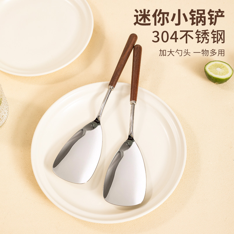 304ステンレスの鍋シャベルを厚くして炒めます。シャベルのシャベルのスプーンは家庭用調理器具の木の柄のセットの鉄シャベルのスプーンに漏れます。