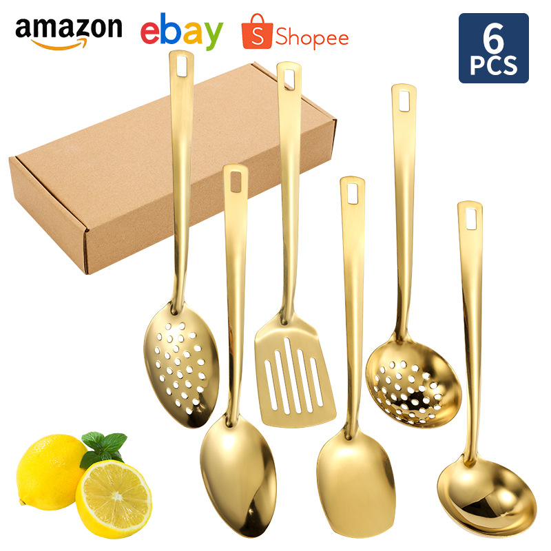 クロスボーダー6pcシャベルのスープの殻のスープの漏れの先のスプーンの金メッキの台所の軽いステンレスの台所の6セットのプレゼントの箱の中で