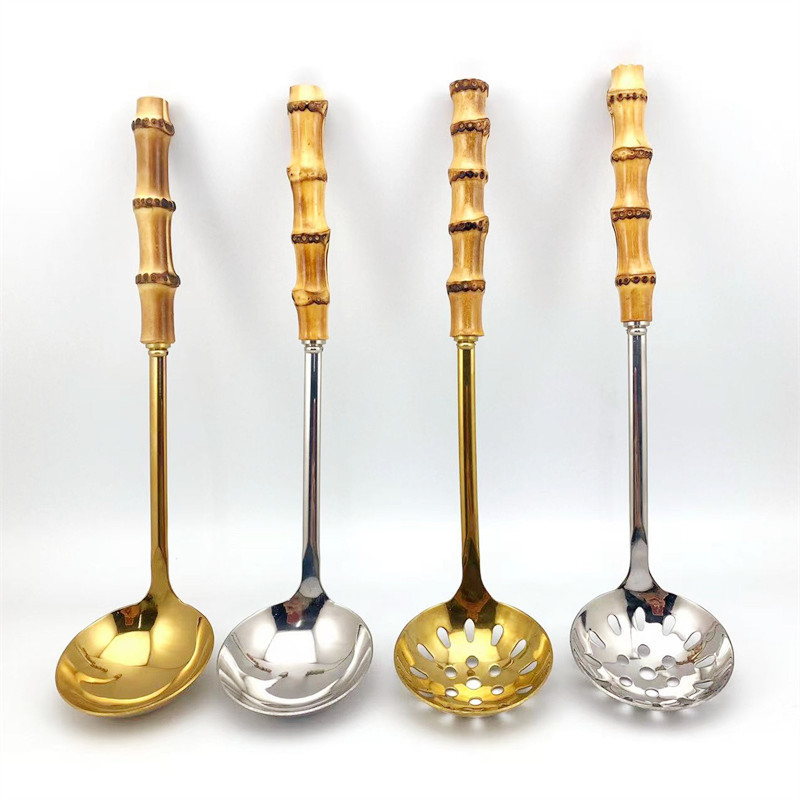 ステンレス製の金色の小さなスプーンの小さなスプーンの竹の柄の火鍋のスプーンの台所のガジェットのホテルのレストランの共用スプーン