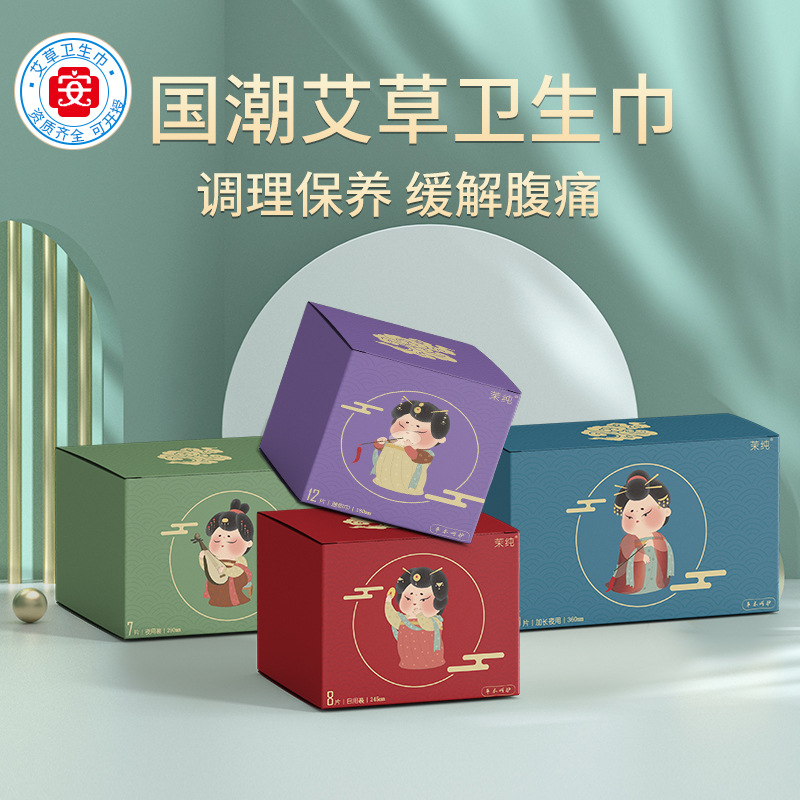 国潮艾草生理用ナプキン工場卸売、昼夜用パッド、エクストラロング生理用ナプキン、箱詰め、在庫あり、送料無料