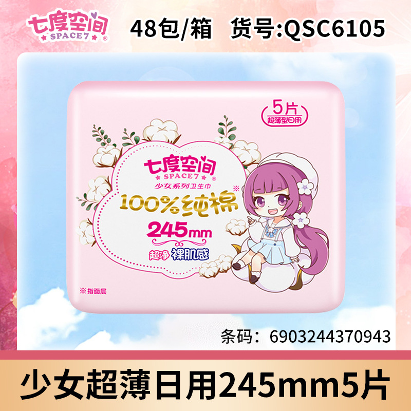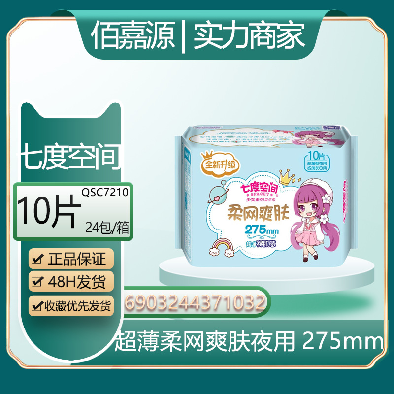 7度. 空間生理用ナプキン少女純綿夜用衛生275mm10枚【QSC6210】全箱卸売り