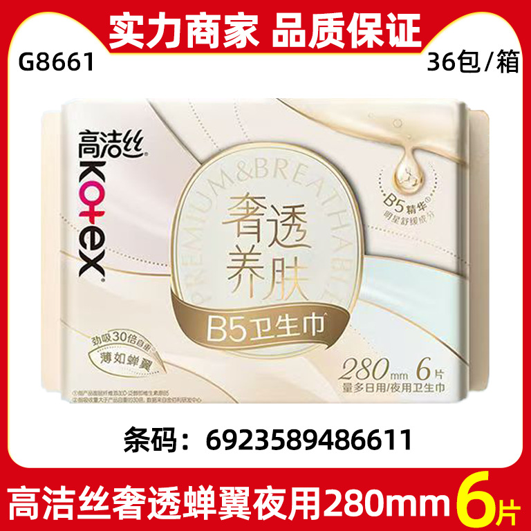 高潔絲生理用ナプキン卸売、贅沢な肌ケア、280mm夜用、6枚入り、純綿通気性シルク薄型生理用ナプキン