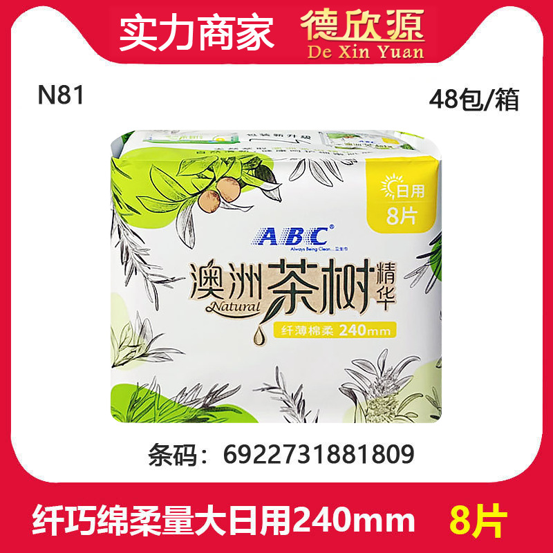 批发ABC日用纤薄网感棉质表层澳洲茶树精华卫生巾240mm8片N81