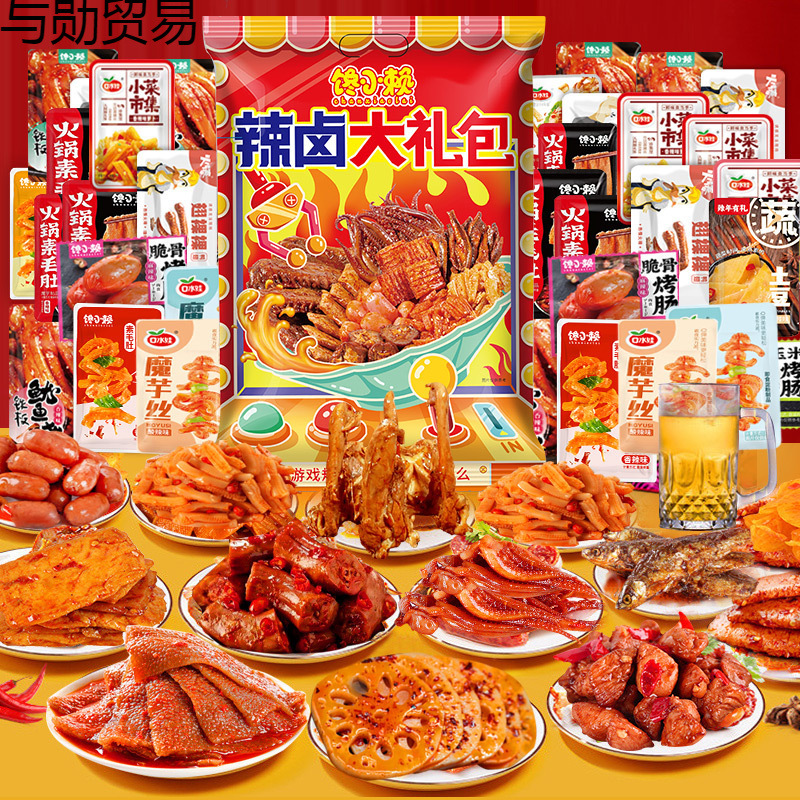 スパイシーポークスナックギフトパック、煮込み食品全箱、夜食、空腹を満たすスナック、調理済みベジタリアンミート、アヒルの首、魚豆腐、スパイシーストリップ