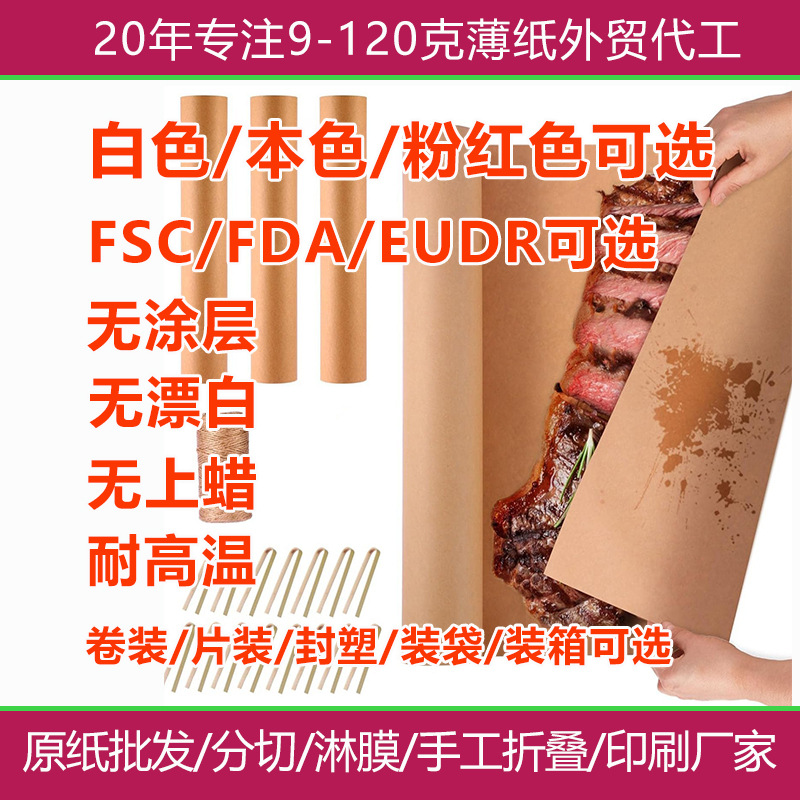 食品グレードの屠殺業者用紙、耐油性、耐高温性、肉包装紙、30g-60g、耐油紙、認証済みクラフト紙