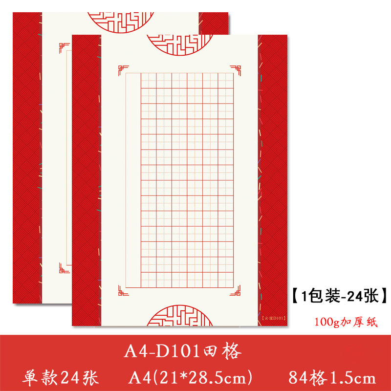 赤い中国風テーマスタイル作品紙硬筆84格書道紙a4田字格試合専用紙d101