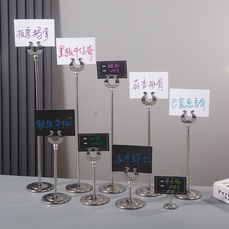 ステンレス台のナンバープレートの結婚式のテーブルのナンバープレートのメニューの展示札の価格のテーブルのブランドの縦型の料理札は展示札を挟みます。
