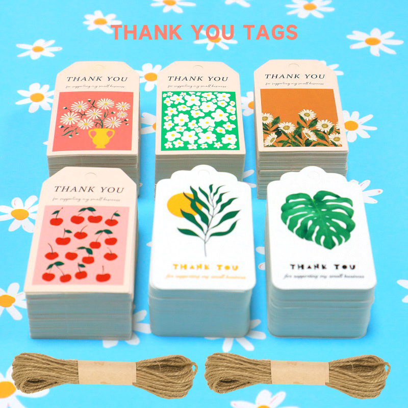 50枚/バッグ花卉果物ラベル付き10m麻紐カラー印刷ありがとうラベル吊り札ギフト包装装飾