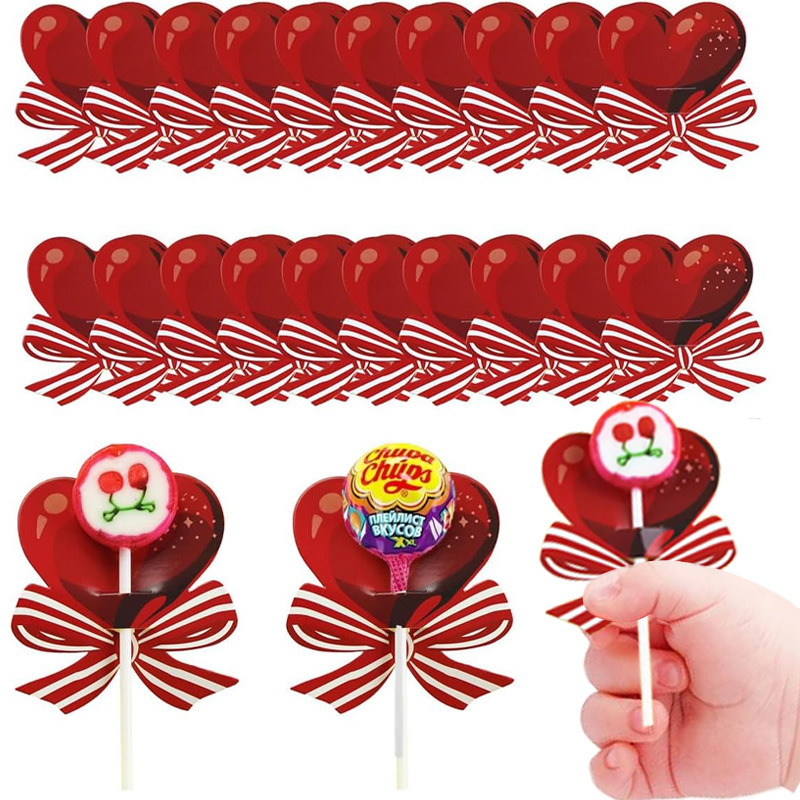 赤いハート型の蝶結びのロリポップの装飾カードの贈り物の包装箱はロリポップの装飾カードのパーティーを飾ります。
