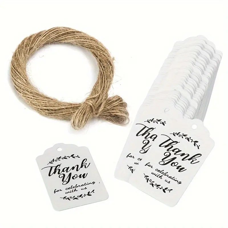 100pcs「私たちと一緒にお祝いしてくれてありがとう」ラベルクラフト紙ギフトラベルと10メートル麻紐