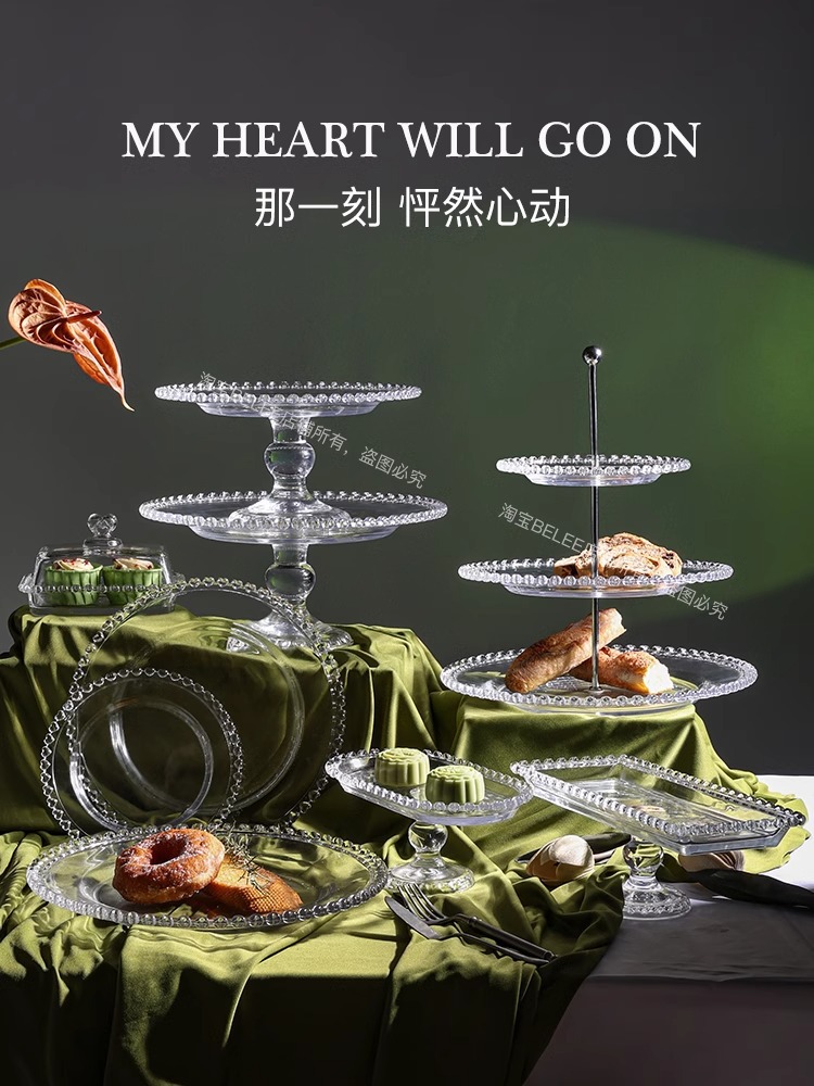 透明デザートテーブルガラスハイトレイアフタヌーンティーティーブレイクプレート白多層フルーツプレートペストリープレート