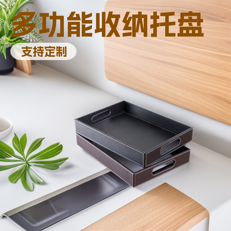 黒いpu革トレイ家庭用ホテルのお茶の雑物は取っ手の収納箱の工場を持っています。