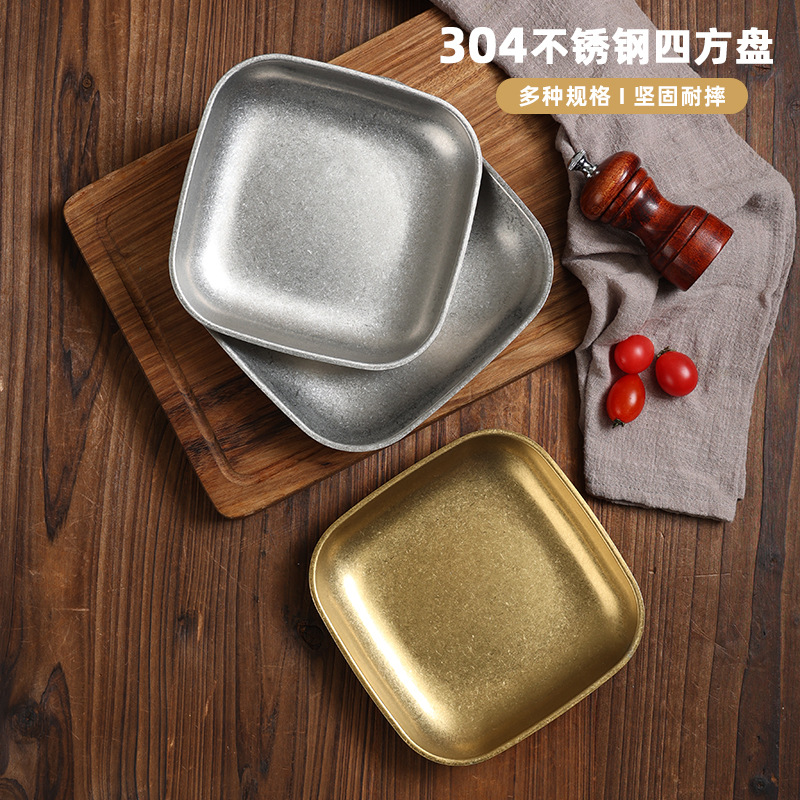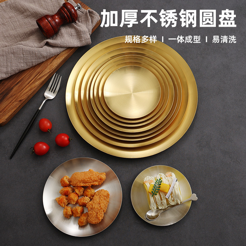 韓国式の厚いステンレスの円盤の金色の喫茶店のデザートのケーキのトレーの料理の皿は平皿を焼いて骨の皿を吐きます。