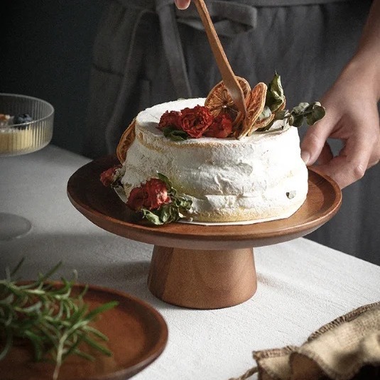 円形の高い足の木製ケーキ皿家庭用リビングルームのお茶の実木果物のスナック皿の下のお茶のお菓子の展示皿