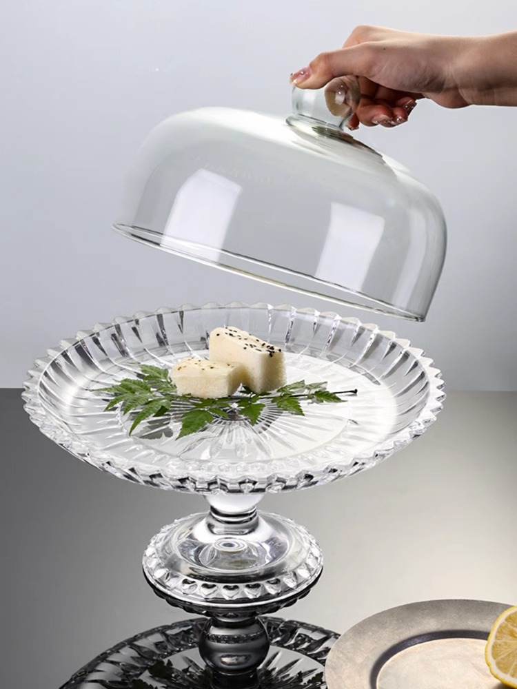 蓋付きヨーロッパガラスケーキプレート、家庭用フルーツプレート、クリエイティブな背の高いデザートトレイ、商業用おもてなしフルーツプレート