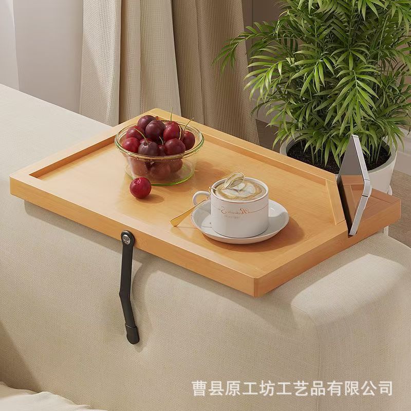 木製の長方形の手すりのトレーの間食のコーヒー皿は竹のソファーの腕を調節してテーブルの携帯電話のスタンドを挟むことができます。
