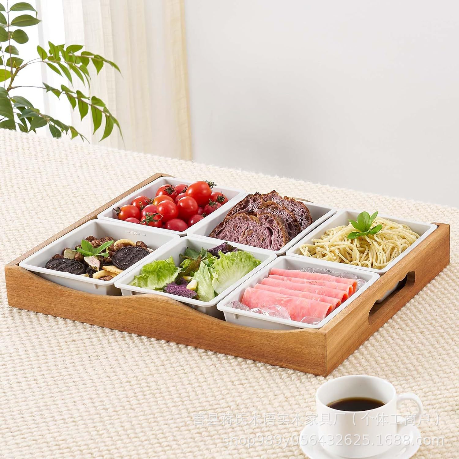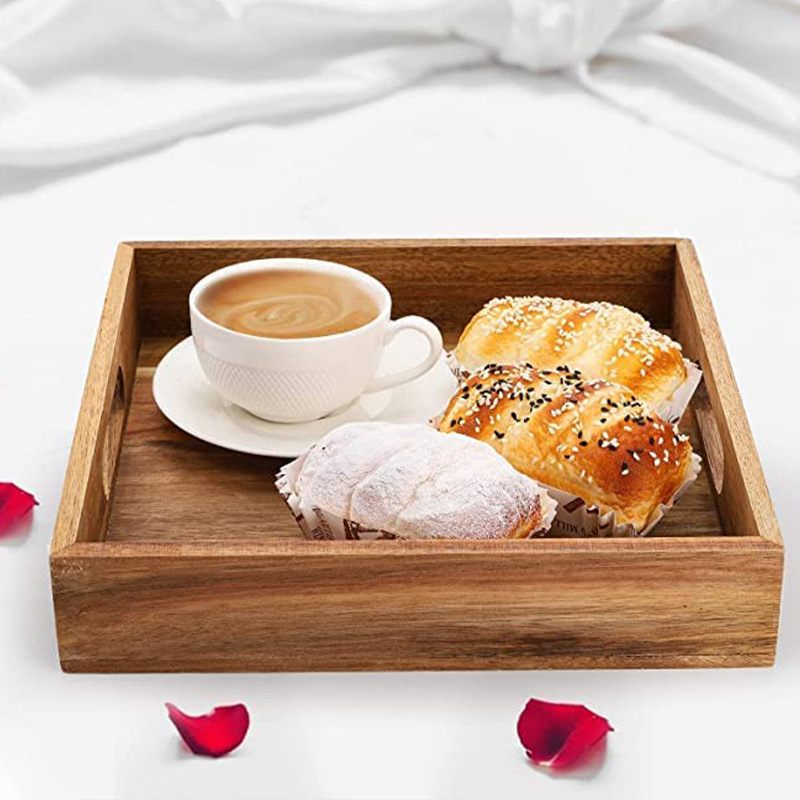 竹のトレーのホテルのサービスのコップの皿の間食のお菓子の皿のアカシアの木のトレーの正方形の取っ手のピクニックの皿